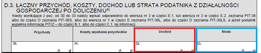 * W przypadku kiedy w PIT/B kwota widnieje w polu strata i wartość z punktu D ujętego w tabeli wynosi zero, należy przyjąć dochód przedsiębiorcy jako wartość 0 |