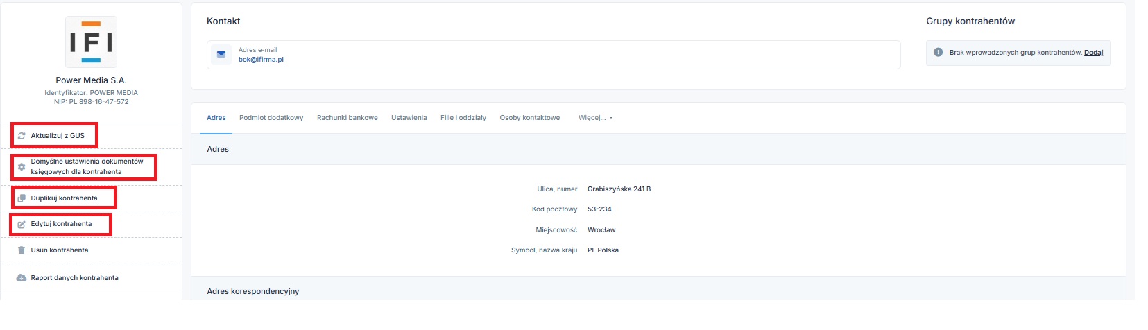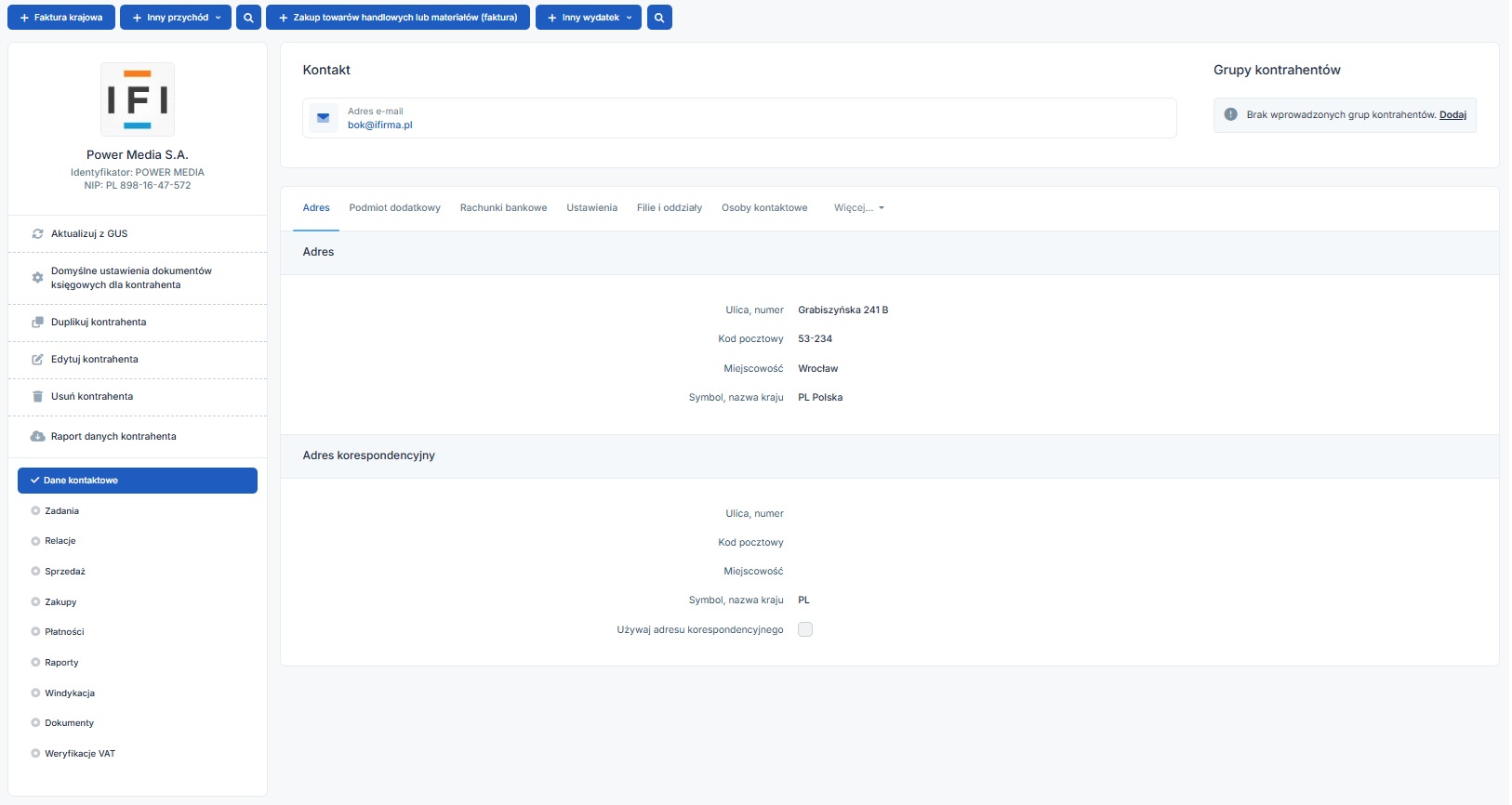 • karta dane kontaktowe – zawierająca części: kontakt (np. z numerem telefonu czy adresem mailowym kontrahenta), adres (adres kontrahenta wraz z adresem korespondencyjnym), dane odbiorcy wraz z przypisaniem kontrahenta do grup, rachunek bankowy, ustawienia (np. informację czy kontrahent został oznaczony jako osoba fizyczna a także ustawienia w zakresie wydatków i przychodów), filie i oddziały, osoby kontaktowe, uwagi oraz ustawienia dokumentów (wprowadzone ustawienia wydatków i przychodów). Na karcie Dane kontaktowe znajduje się również zakładka Zestawienie danych. Więcej informacji na ten temat w punkcie edycja danych kontrahenta.