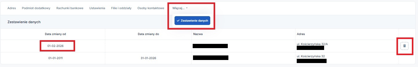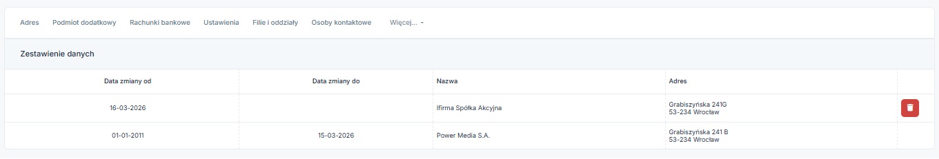 W powyższym zestawieniu danych widzimy, iż dane adresowe kontrahenta zmieniły się od 01.02.2026 r. W związku, z tym iż po tej zmianie wystawiane były dokumenty – nie można jej usunąć. W przypadku wprowadzenia zmiany danych w błędny sposób – np. od niewłaściwego dnia czy w błędnym zakresie – możliwe jest usunięcie dodanej zmiany i wprowadzenie jej ponownie.