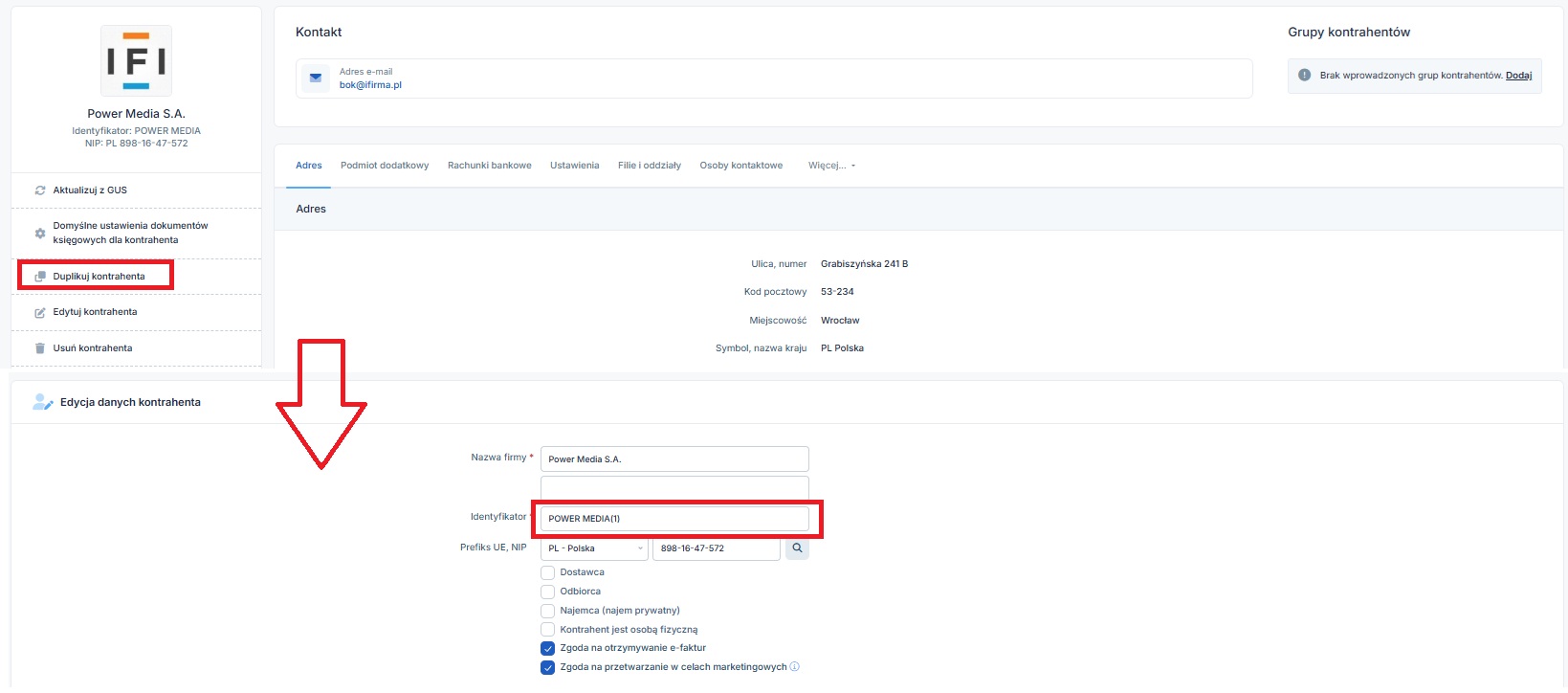 Użytkownik zmienia odpowiednie (najczęściej nieaktualne) dane kontrahenta i zatwierdza zmiany. Duplikowanie powoduje dodanie nowego kontrahenta, z nowym identyfikatorem. Podczas duplikowania, w celu odróżnienia nowego kontrahenta, serwis automatycznie dodaje do jego identyfikatora kolejną liczbę. Użytkownik może dokonać zmiany w tym zakresie.