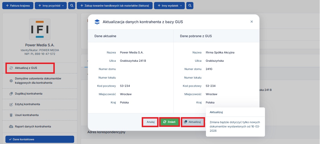 Ostatnią z funkcji, pozwalająca na zmianę danych kontrahenta jest funkcja aktualizuj z gus. Po jej wybraniu serwis pobierze aktualne dane kontrahenta z bazy gus (na podstawie nr NIP) i wyświetli ich porównanie z danymi wprowadzonymi na konto Użytkownika.