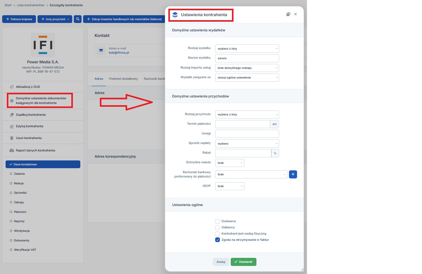 • edycja lub dodanie domyślnych ustawień dokumentów księgowych dla kontrahenta.