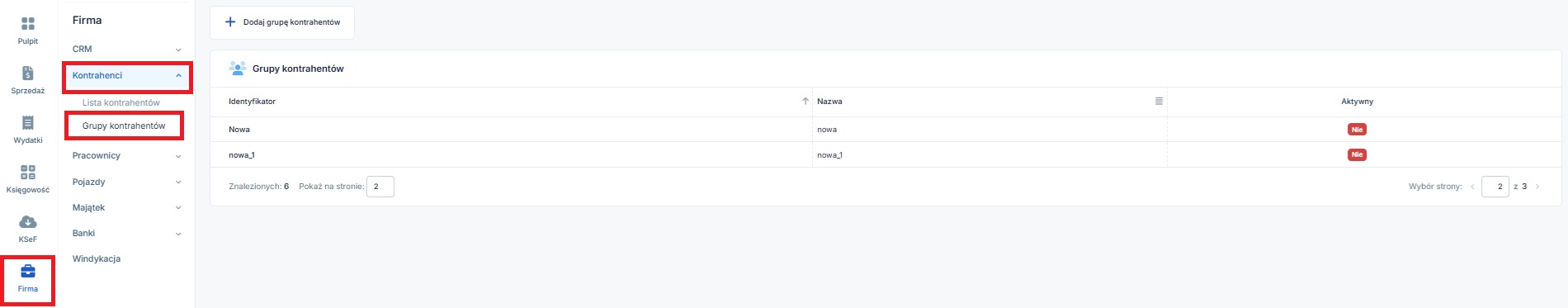 W zakładce Grupy kontrahentów widoczna jest lista już utworzonych grup (wraz z ich nazwami, identyfikatorami i oznaczeniem ich aktywności) oraz funkcja dodawania nowej grupy (+ dodaj grupę kontrahentów).