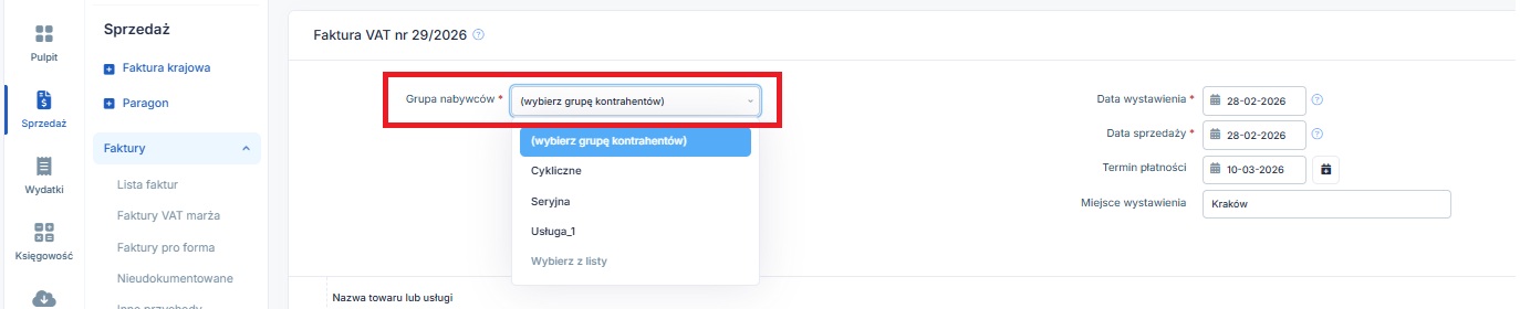 Podczas dodawania nowej grupy serwis zaznacza checkbox przy polu Odbiorca. Takie oznaczenie powoduje, że grupa ma status aktywnej, tzn. podczas korzystania np. z seryjnego wystawiania faktury możliwe będzie wybranie z listy w polu Grupa kontrahentów.