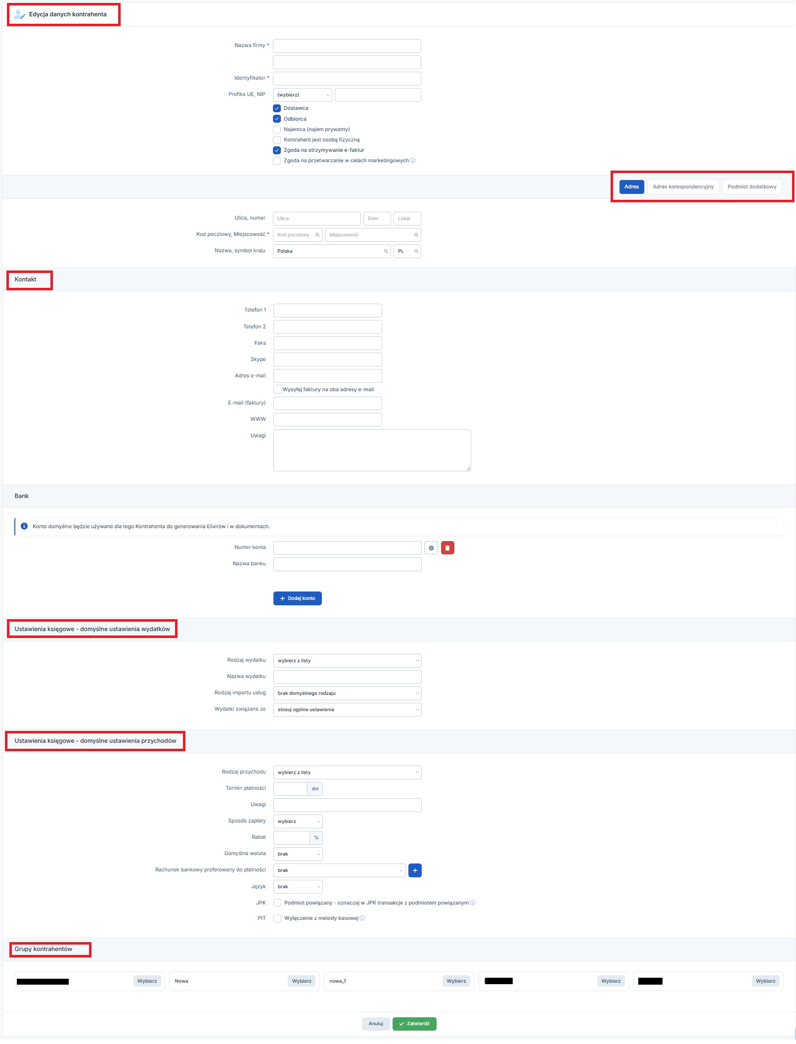 W przypadku kiedy nowy kontrahent wprowadzany jest za pomocą funkcji + wprowadź samodzielnie, wszystkie dane należy uzupełnić ręcznie.