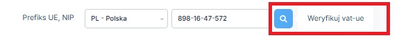 • prefiks UE, NIP – uzupełniamy zgodnie z informacjami przekazanymi od nabywcy. Po uzupełnieniu nr NIP i wybraniu prefiksu dostępna będzie funkcja weryfikacji kontrahenta w bazie VIES.