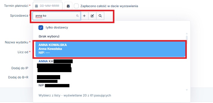 Oznaczenie checkboxa przy polu Dostawca spowoduje, iż kontrahent pojawi się na liście sprzedawców podczas księgowania wydatku. Z kolei oznaczenie checkboxa przy polu Nabywca powoduje, iż kontrahent pojawi się na liście nabywców podczas wystawiania faktury. W obu tych wypadkach odnalezienie właściwego kontrahenta nie będzie wymagało korzystania z opcji szukaj. Kontrahenta będzie można wyszukać po wpisaniu części jego danych np. nazwy, identyfikatora, adresu czy adresu mailowego lub w polu Nabywca lub Sprzedawca. W związku z tym aby wyszukać takiego kontrahenta nie ma potrzeby korzystania z funkcji szukaj kontrahenta. Podczas wprowadzania kontrahenta oba te pola są domyślnie zaznaczone.