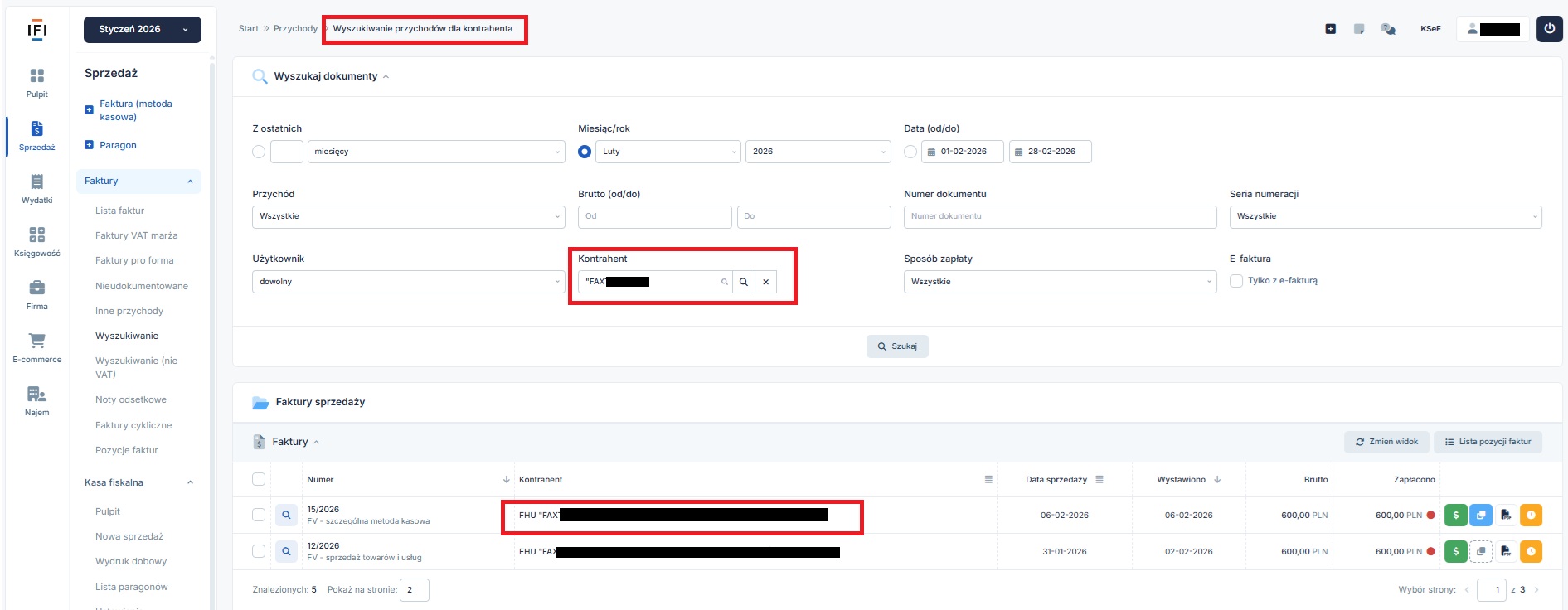 Wybór funkcji przychodów w kolumnie Wyszukiwanie spowoduje wyświetlenie formularza Wyszukiwanie przychodów dla kontrahenta.