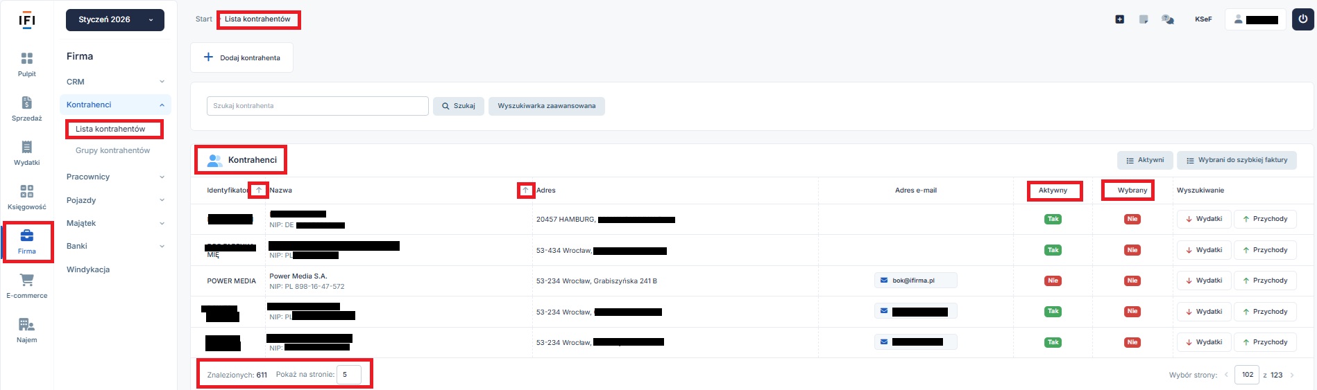 Lista kontrahentów dostępna w zakładce Firma ➡ Kontrahenci ➡ Lista kontrahentów obejmuje następujące elementy: