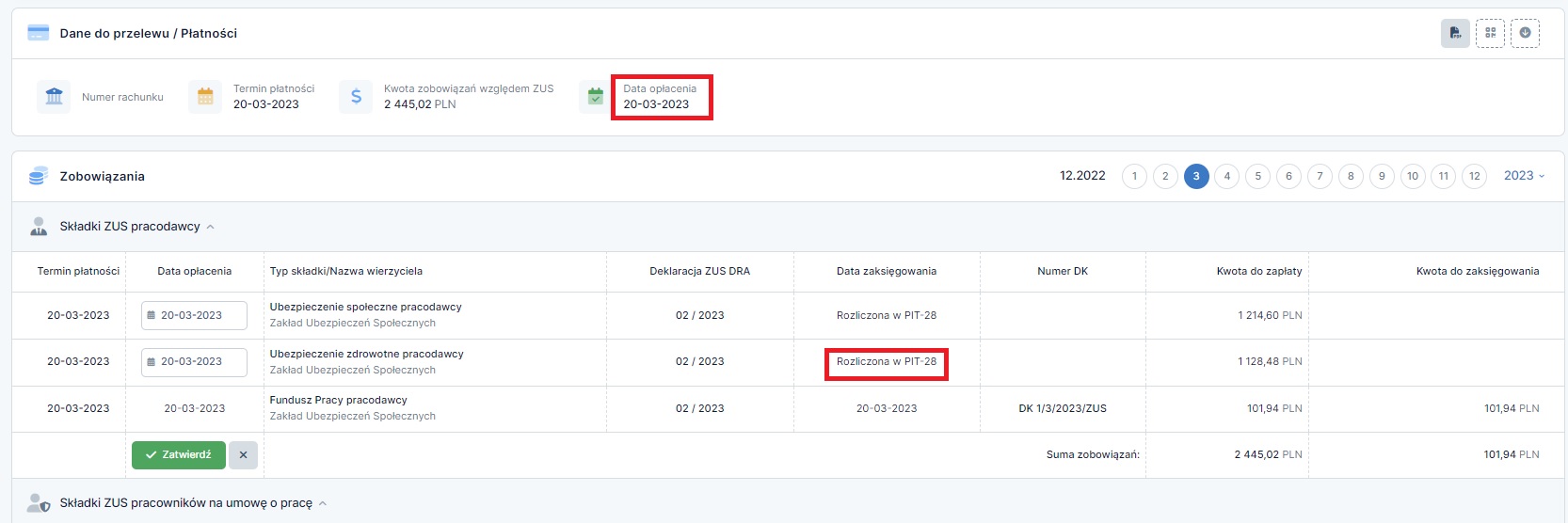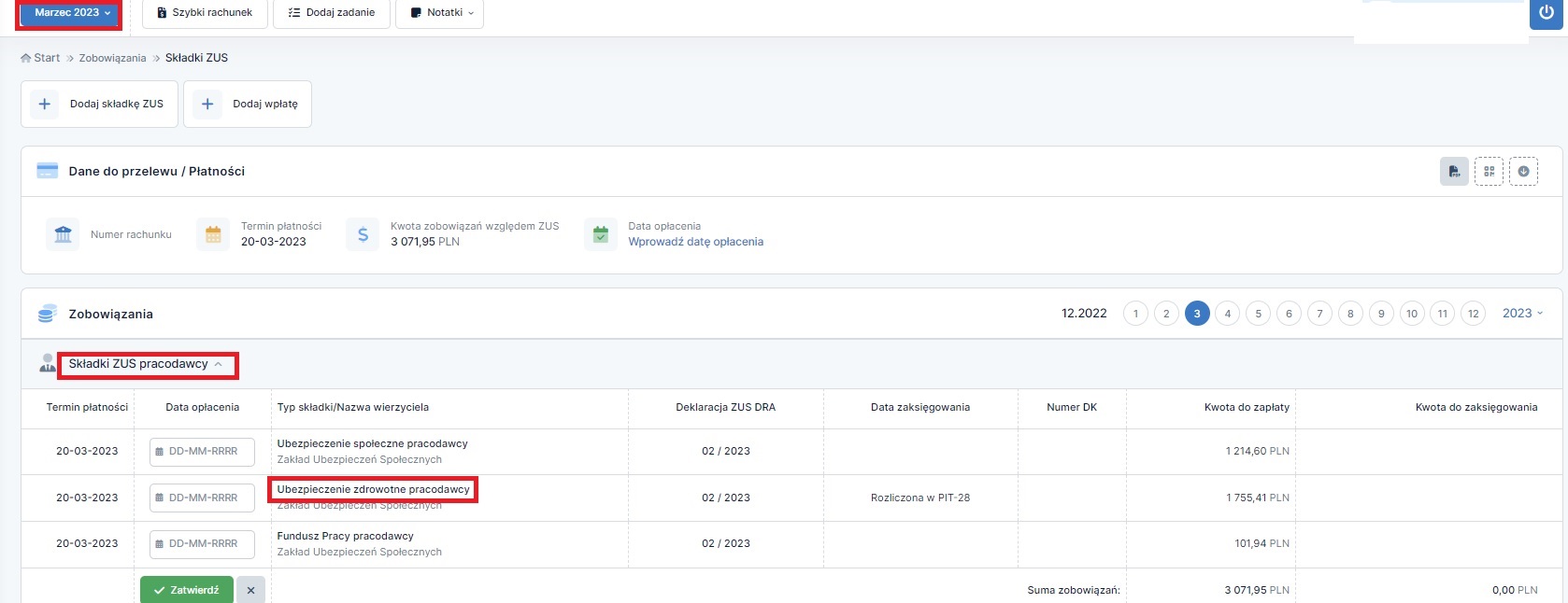W momencie jak płatnik wprowadzi daty opłacenia składek ZUS w zakładce Zobowiązania ➡ Składki ZUS, wówczas zgodnie z przedstawionym zrzutem, składka na ubezpieczenie zdrowotne nie zostanie rozliczona w serwisie, co jest prawidłowym działanie.