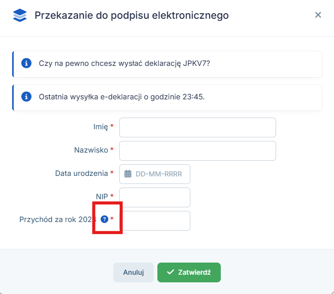 W przypadku, gdy nie wiemy skąd wziąć kwotę przychodu, można skorzystać z podpowiedzi klikając (symbol “?”).