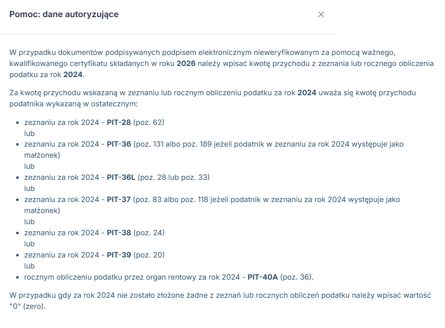 Komunikat „Weryfikacja negatywna – błąd w danych autoryzujących (np. błąd w nazwisku, pierwszym imieniu, dacie urodzenia, NIP, numerze PESEL, kwocie przychodu)” oznacza, że deklaracja nie została przyjęta przez urząd. W takiej sytuacji należy sprawdzić poprawność podanej kwoty przychodu oraz danych osobowych w zakładkach: