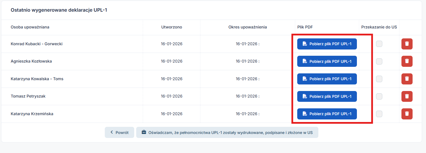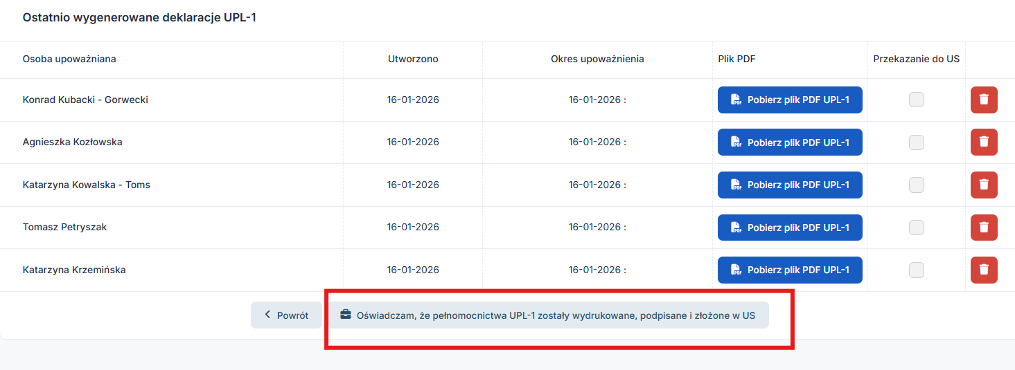 Po złożeniu UPL-1 do US dla wszystkich osób, należy wybrać opcję Oświadczam, że pełnomocnictwa UPL-1 zostały wydrukowane, podpisane i złożone w US.