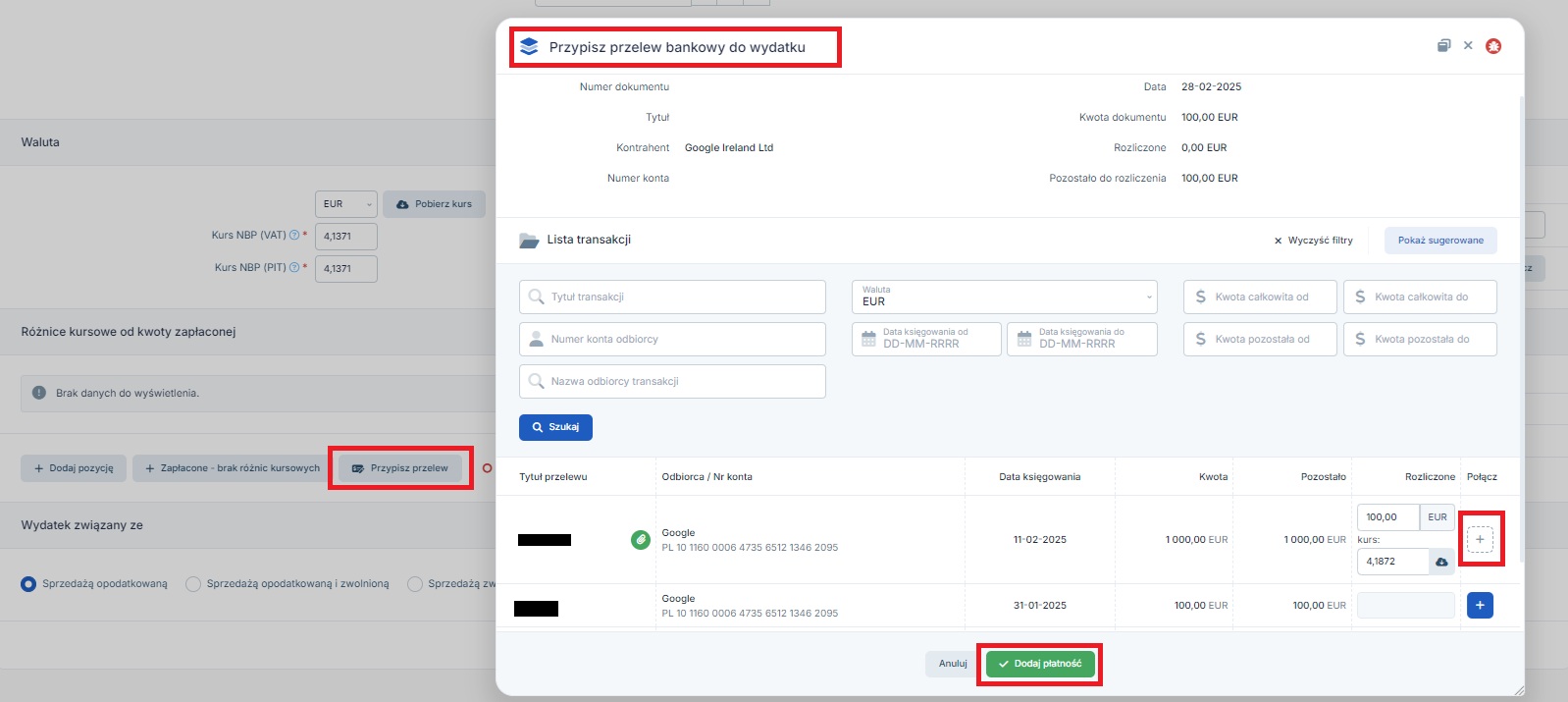 Jak zostało wskazane wcześniej Użytkownik dokonał zapłaty z konta walutowego. W związku z tym po wpisaniu daty zapłaty oraz po wybraniu jako formy zapłaty waluty obcej mógł skorzystać z pola Pobierz kurs. Pozwoliło to na pobranie średniego kursu NBP z ostatniego dnia roboczego poprzedzającego datę dokonania zapłaty. Po zatwierdzeniu wydatek zmienił status na opłacony. W związku z tym, iż kurs zastosowany do przeliczenia faktury na złotówki był taki sam jak kurs zapłaty, nie powstały transakcyjne różnice kursowe. Związane z zapłatą z konta walutowego różnice kursowe z wyceny środków na rachunku bankowym Użytkownik wylicza samodzielnie a następnie księguje jako pozostały wydatek lub pozostały przychód. Więcej informacji na ten temat tutaj.