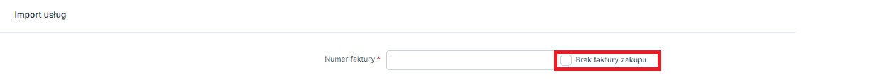 Użytkownik uzupełnia numer dokumentu wystawionego przez kontrahenta zagranicznego. Uzupełnienie tego pola jest obowiązkowe. W przypadku braku faktury, konieczne jest zaznaczenie checkboxa brak faktury zakupu. Takie ustawienie w formularzu wpływa na sposób uzupełnienia kolejnych pól.