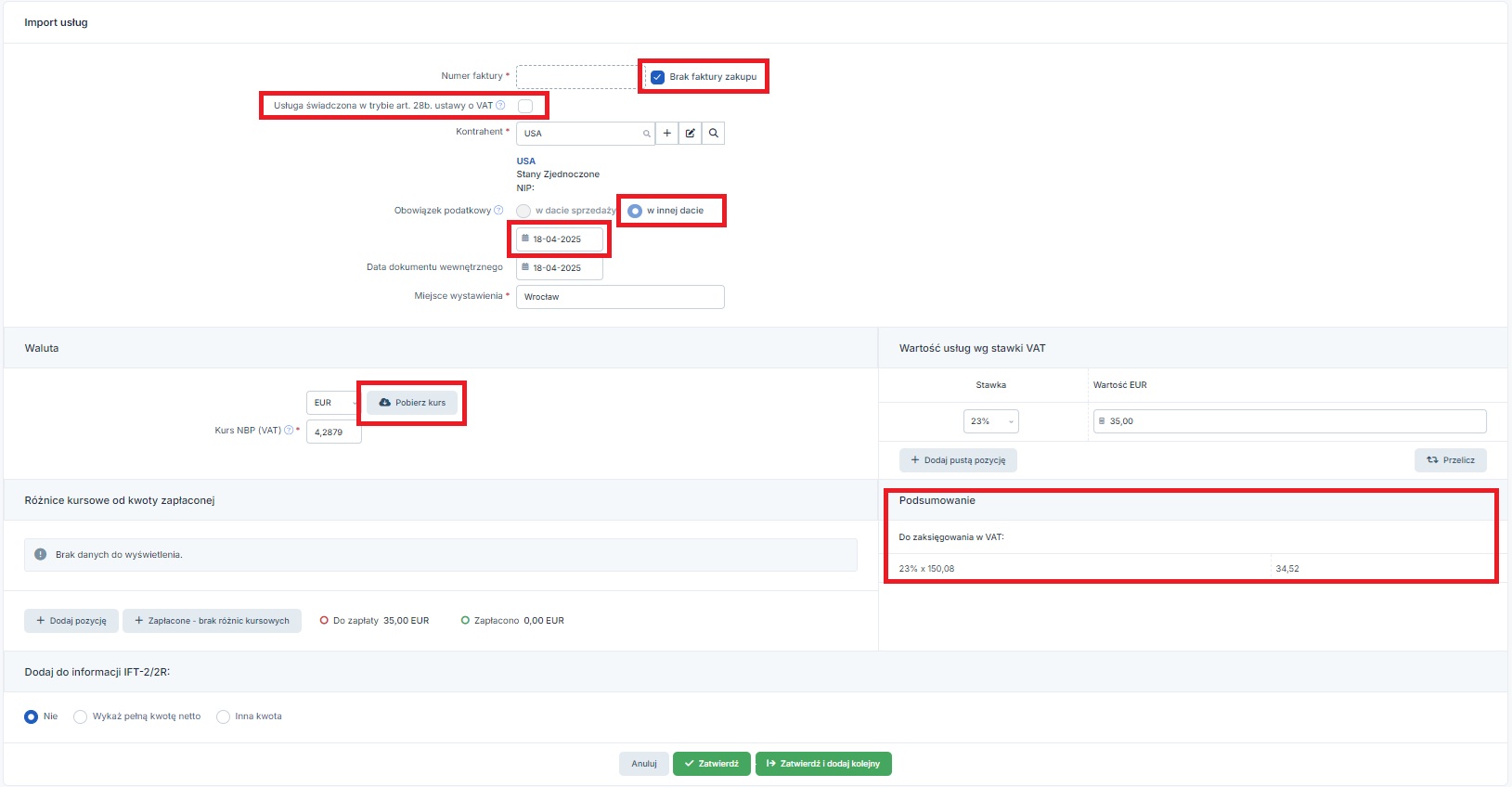 Użytkownik – podatnik korzystający ze zwolnienia z VAT rozliczający się w oparciu o KPiR dokonał zakupu w USA usługi elektronicznej. Zapłata została dokonana 14.04.2025 r. Usługa została wykonana 20.04.2025 r. Zapłata została dokonana w walucie z konta złotówkowego. Przedsiębiorcy nie udało się uzyskać od sprzedawcy faktury. Wartość zakupionej usługi 35 USD.
