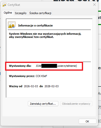 Uwaga! Wgrywając certyfikat do ifirma.pl należy sprawdzić, czy na pewno uprawnienia w KSeF są nadane na osobę, na którą został wystawiony certyfikat. Żeby sprawdzić, na kogo jest wystawiony wgrany certyfikat wystarczy otworzyć plik crt. Na karcie Ogólne będzie widać na kogo certyfikat jest wystawiony oraz datę ważności wystawionego certyfikatu. Tak jak na zrzucie poniżej.