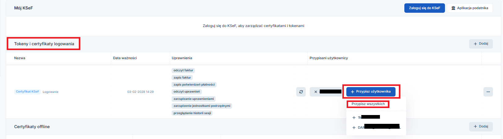 Podczas dodawania certyfikatu/tokenu bardzo ważne jest, żeby wybrać, czy tylko jedna osoba będzie korzystała z KSeF w ramach danego konta (domyślnie będzie to użytkownik jaki wgrał certyfikat na konto), czy również będą taki dostęp mieli pozostali użytkownicy konta. Opcja widoczna jest w konfiguracji połączenia KSeF na koncie przy wgranym tokenie/certyfikacie. wystarczy wybrać + Dodaj użytkownika, lub Przypisz wszystkich.