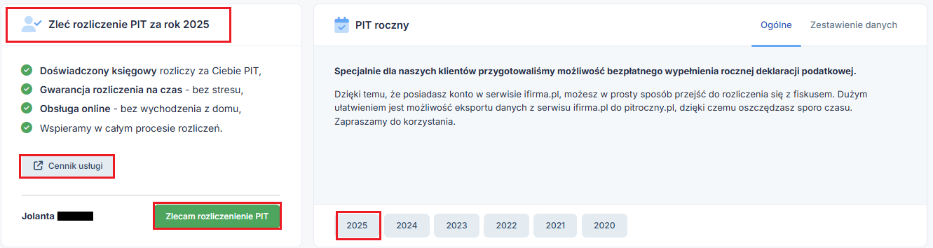 Użytkownik księgowości internetowej dodatkowo może zlecić rozliczenie PIT za 2025 wybierając opcję Zleć rozliczenie PIT.