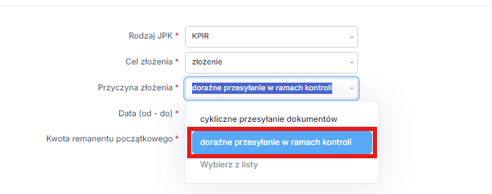 W polu Przyczyna złożenia wybieramy doraźne przesyłanie w ramach kontroli. Plik JPK_PKPiR jest przekazywany na wezwanie organów podatkowych w związku z przeprowadzaną kontrolą.