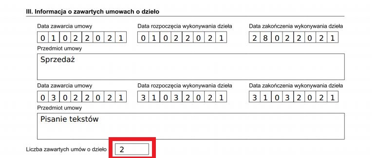 W formularzu ZUS RUD do wypełnienia i wydruku można przekazać informację o maksymalnie dziesięciu umowach o dzieło zawartych z danym wykonawcą.