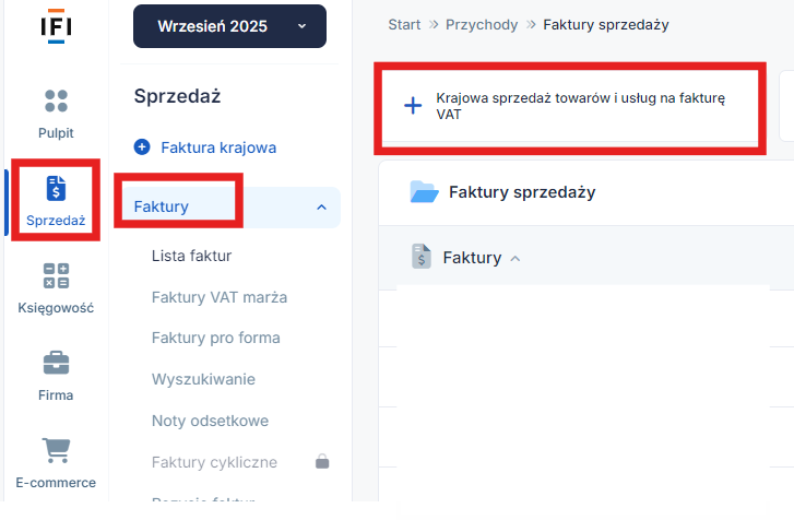 W celu wystawienia takiej faktury należy wybrać zakładkę Sprzedaż ➡ Faktury ➡ Krajowa sprzedaż towarów i usług na fakturę VAT.