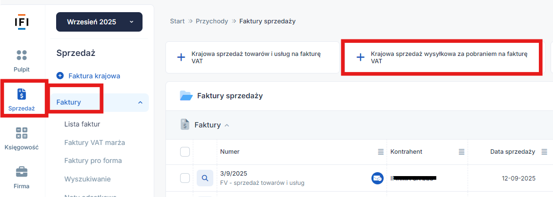 W celu wystawienia takiej faktury należy wybrać zakładkę Sprzedaż ➡ Faktury ➡ Krajowa sprzedaż wysyłkowa za pobraniem na fakturę VAT.