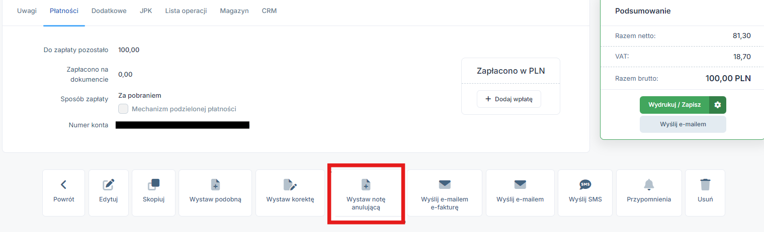 Dla tego formularza faktury została stworzona dodatkowa opcja Wystaw notę anulującą, która jest dostępna na samym dole w szczegółach faktury.