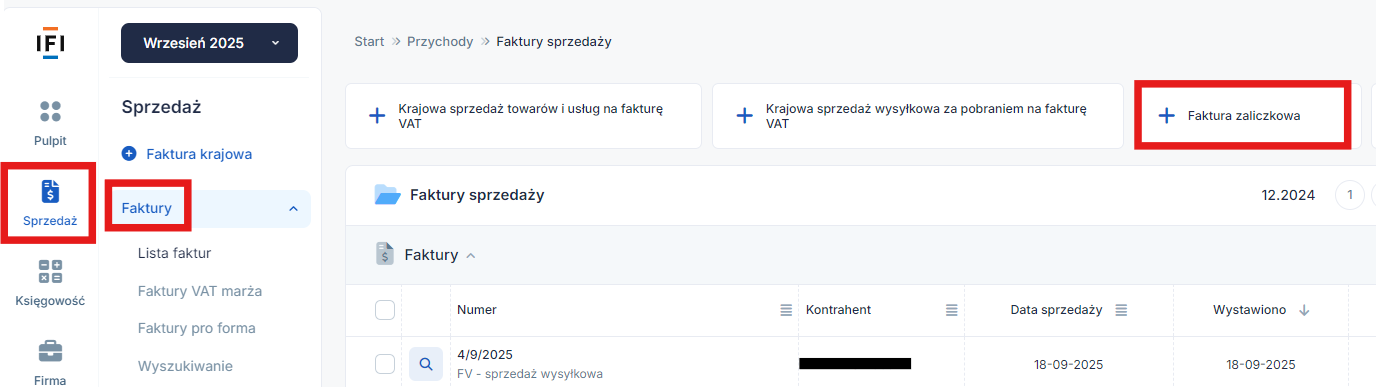W celu wystawienia takiej faktury należy wybrać zakładkę Sprzedaż ➡ Faktury ➡ Faktura zaliczkowa.