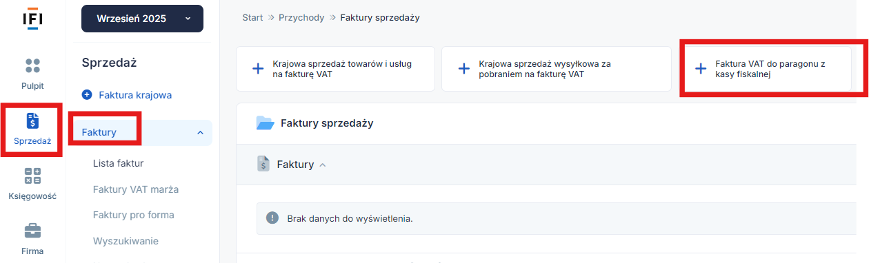 W celu wystawienia takiej faktury należy wybrać zakładkę Sprzedaż ➡ Faktury ➡ Faktura VAT do paragonu z kasy fiskalnej.