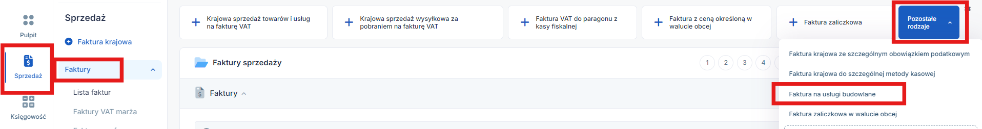 Fakturę wystawiamy w zakładce Sprzedaż ➡ Faktury ➡ Pozostałe rodzaje ➡ Faktura na usługi budowlane.