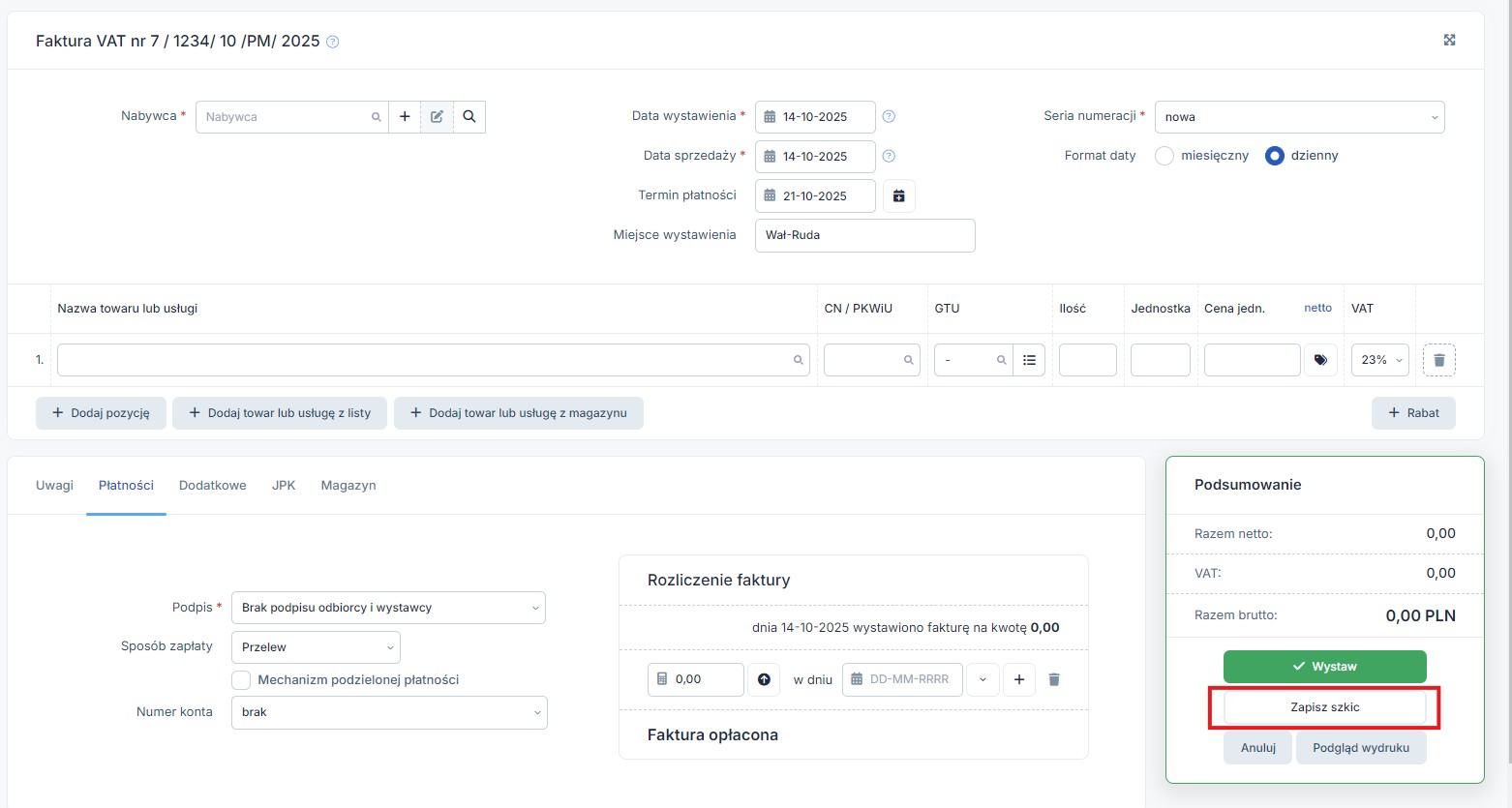 Szkic faktury można wystawić przechodząc do jednego z wyżej wymienionych formularzy faktury. Można uzupełnić wszystkie dane faktury lub tylko część (pole nabywca oraz pozycja faktury są obowiązkowe) i zapisać w formie szkicu: