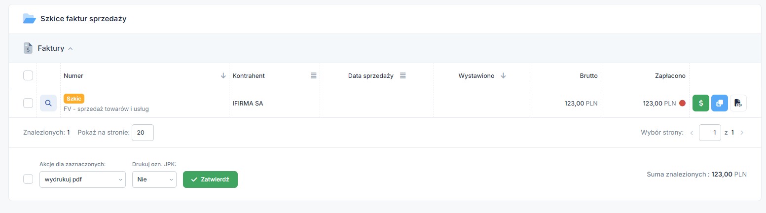 Po zapisaniu szkicu, będzie on widoczny na liście faktur, w części Szkice faktur sprzedaży.
