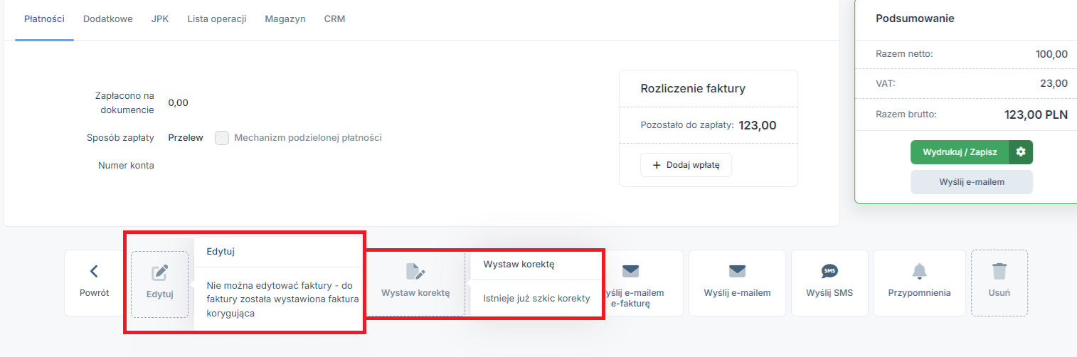 Dla faktury sprzedaży można również analogicznie wystawić szkic faktury korygującej, należy jednak pamiętać, że nie można edytować faktury sprzedaży dla której jest wystawiony szkic korekty: