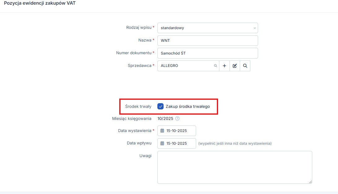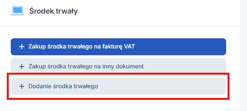 Środek trwały można wprowadzić do ewidencji na podstawie dowodu przyjęcia środka trwałego do używania (wzór do pobrania znajduje się na naszej stronie). Należy wprowadzić go przez zakładkę Firma ➡ Majątek ➡ Rejestr środków trwałych ➡ +Dodaj środek trwały ➡ Dodanie środka trwałego.