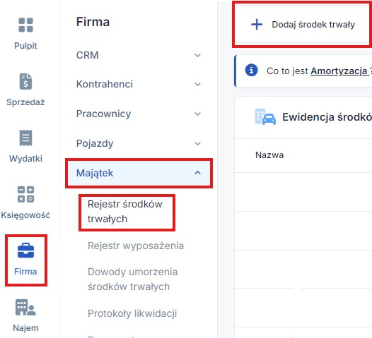 Do ewidencji środków trwałych wprowadzamy całość w momencie, gdy środek trwały jest kompletny i zdatny do użytku. Wprowadzenia dokonujemy na podstawie dowodu przyjęcia środka trwałego do używania (wzór do pobrania znajduje się na naszej stronie). Wprowadzamy go przez zakładkę Firma ➡ Majątek ➡ Rejestr środków trwałych ➡ +Dodaj środek trwały .