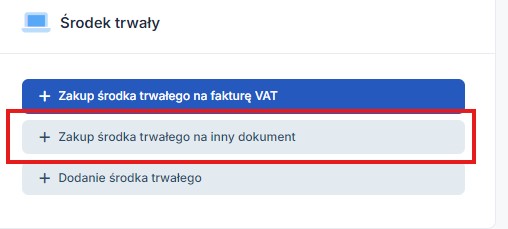 Jeśli na wszystkie części składowe jest wystawiony jeden rachunek lub umowa sprzedaży, wówczas należy dokument wprowadzić przez zakładkę Firma ➡ Majątek ➡ Rejestr środków trwałych ➡ +Dodaj środek trwały ➡ Zakup środka trwałego na inny dokument.