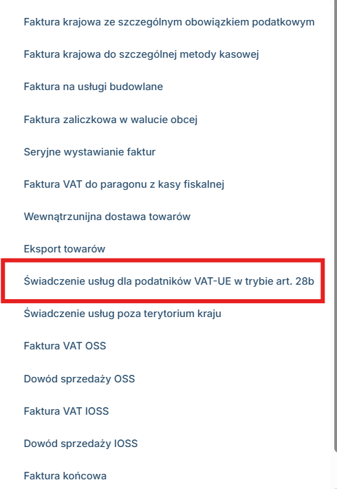 Sprzedaż ➡ Faktury ➡ Pozostałe rodzaje ➡ Świadczenie usług dla podatników VAT-UE w trybie art. 28b