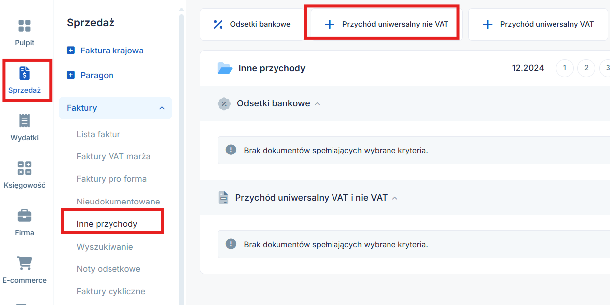 Sprzedaż ➡ Faktury ➡ Inne przychody ➡ Przychód uniwersalny nie VAT,