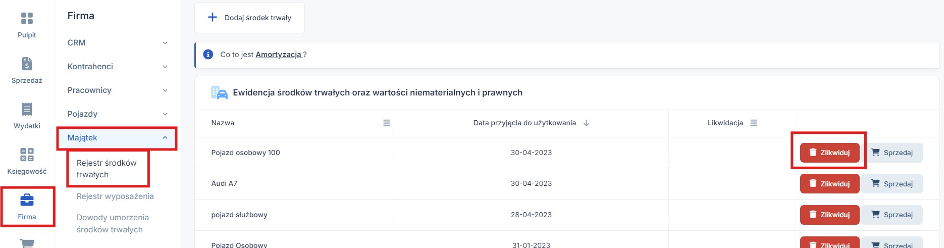 W serwisie likwidacji środków trwałych dokonujemy przez zakładkę Firma ➡ Majątek ➡ Rejestr środków trwałych ➡ Likwidacja.