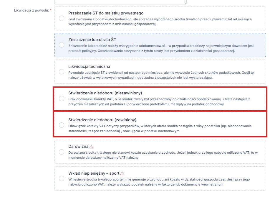Likwidacja środka trwałego z działalności może mieć różne powody. Jednym z nich może być Stwierdzenie niedoboru. Stwierdzenie niedoboru może być niezawinione lub zawinione.