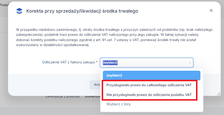 należy zatwierdzić wybór. Pojawi się okno dotyczące rozliczenia podatku VAT. Należy wybrać czy przysługiwało prawo do odliczenia podatku VAT przy zakupie środka trwałego.