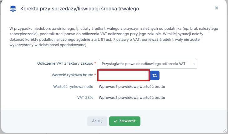 Jeśli natomiast przy nabyciu przysługiwało prawo do odliczenia podatku VAT, to należy wybrać odpowiednią opcję oraz określić wartość rynkową: