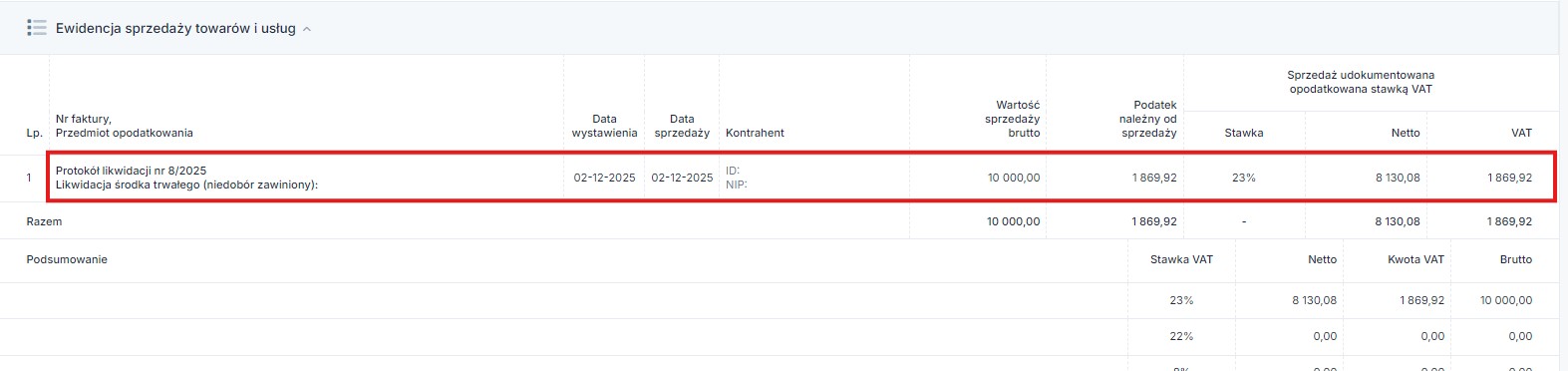 Po zatwierdzeniu wartości rynkowej pojawi się zapis w ewidencji sprzedaży VAT dotyczący korekty VATu: