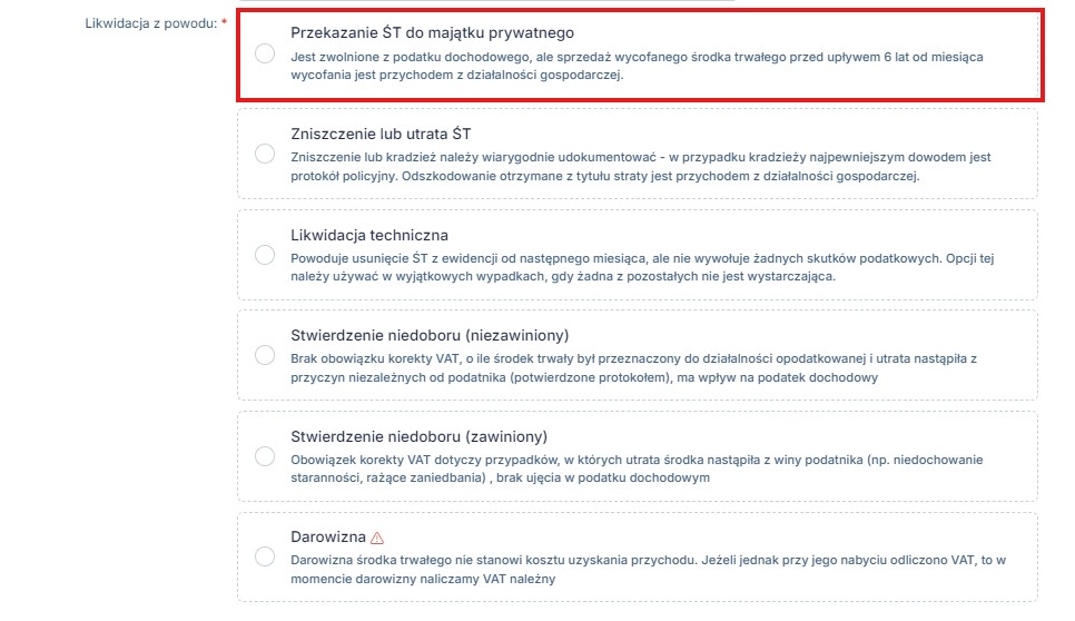 Następnie należy wybrać Przekazanie ŚT do majątku prywatnego