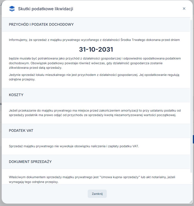 Po zatwierdzeniu formularza pojawi się komunikat dotyczący skutków podatkowych likwidacji: