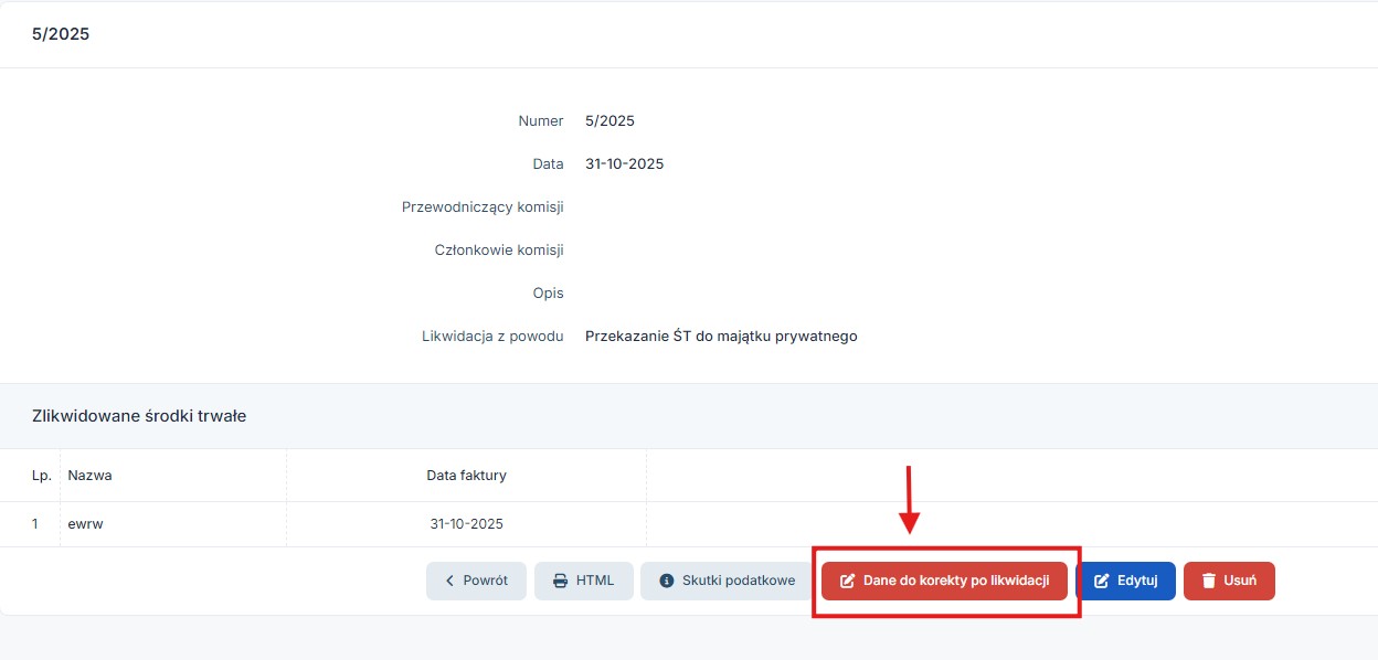 Następnie należy uzupełnić Dane do korekty po likwidacji