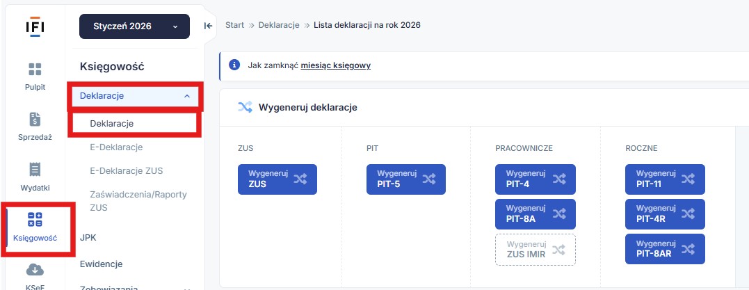 W celu wygenerowania deklaracji rozliczeniowej ZUS, należy w prawym górnym rogu, ustawić się w miesiącu księgowym styczeń 2026 a następnie przejść do zakładki Księgowość ➡ Deklaracje ➡ Deklaracje.