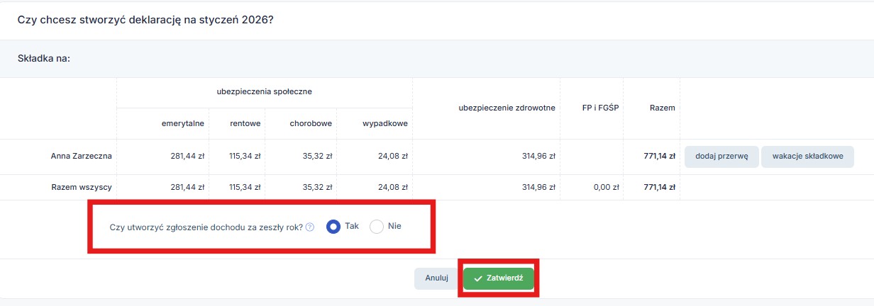 Po zweryfikowaniu opcji utworzenia zgłoszenia, u dołu strony zatwierdzamy wyświetlone składki.