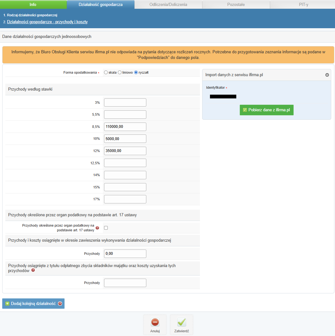 Dane liczbowe z innej działalności można wpisać ręcznie lub zaimportować z serwisu jeśli działalność jest w nim także rozliczana.